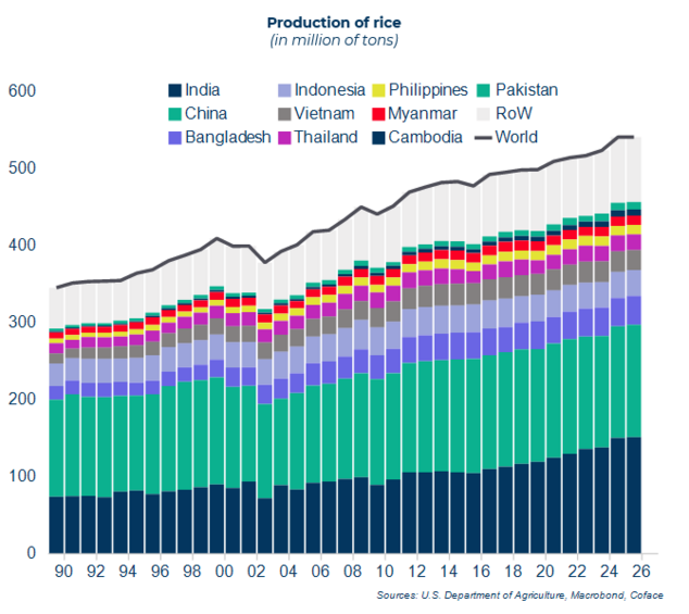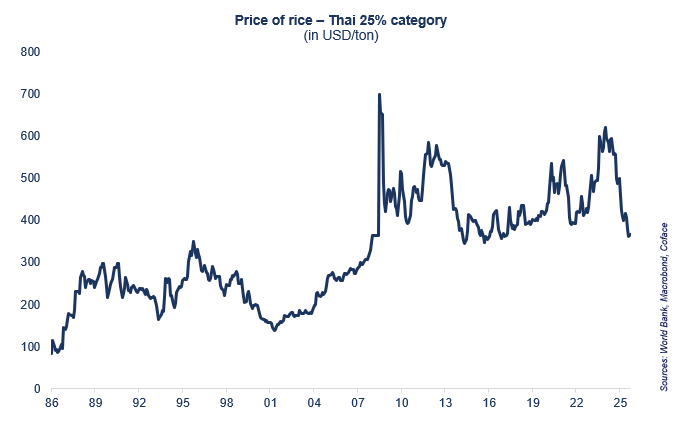 Desde 2022, a Índia — o maior exportador mundial de arroz — impôs restrições às suas vendas externas para conter a subida dos preços globais (aumentos de 19% em 2022 e 2023), provocada sobretudo pela guerra na Ucrânia e pelas más condições meteorológicas na Ásia. A retoma das exportações em 2024, aliada a colheitas recorde na Ásia, levou a uma queda de 35% nos preços em apenas um ano. Com previsões de aumento da produção para 2026 e o possível regresso do fenómeno La Niña no último trimestre de 2025, antecipa-se um excedente crescente de oferta em 2026. Os preços deverão continuar a cair pelo menos até ao final de 2025, com uma possível estabilização em 2026 — em níveis que não se viam há uma década.