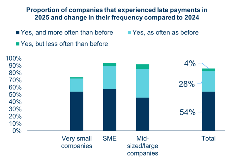 86% das empresas francesas reportam ter enfrentado atrasos nos últimos 12 meses (em comparação com 82% em 2023 e 85% em 2024). Este fenómeno afeta todos os setores, com uma proporção particularmente elevada entre as microempresas: mais de metade considera agora que o impacto na sua liquidez é “crítico”.