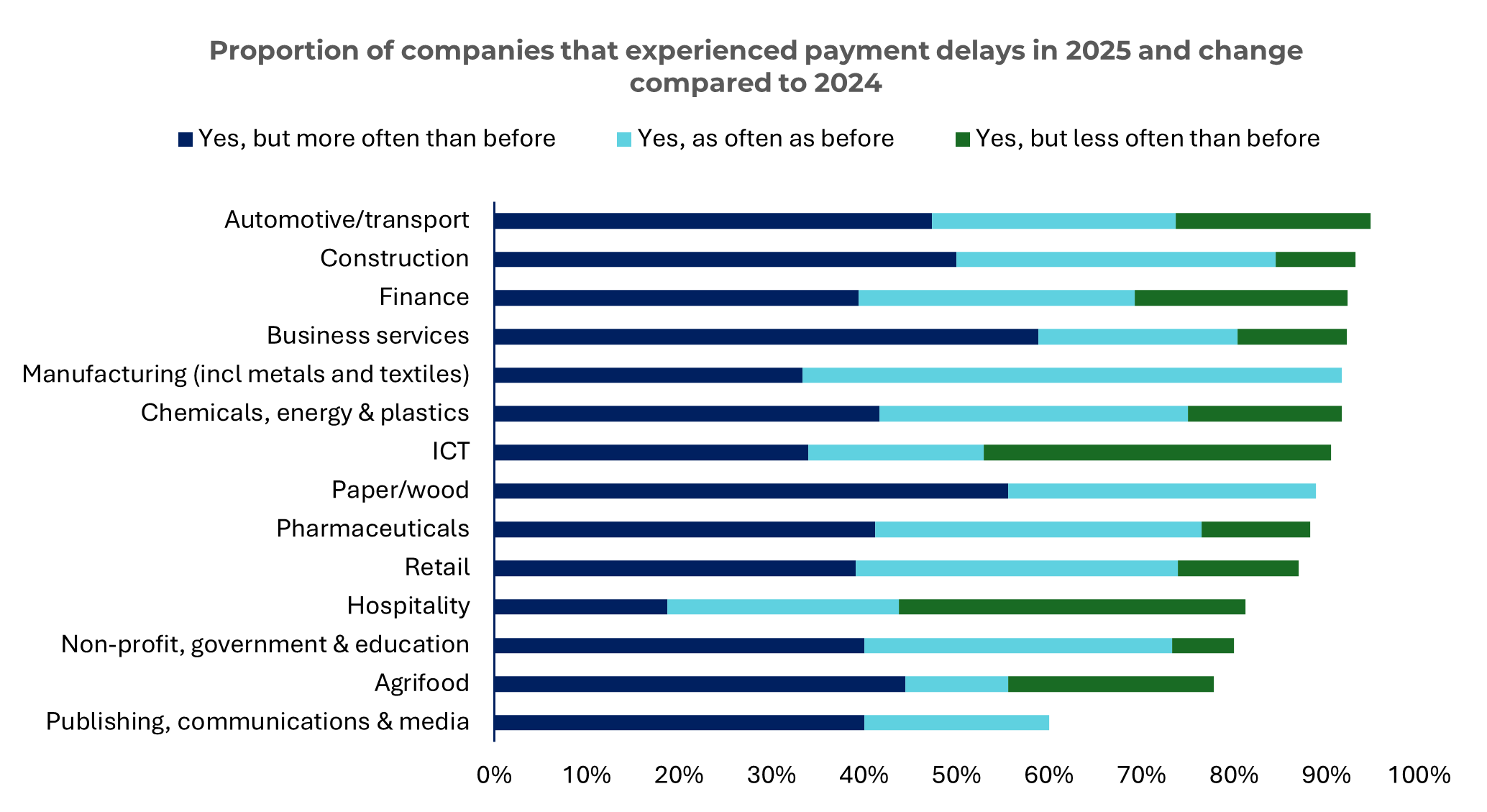 A construção e o setor automóvel/transporte são os mais afetados pelo aumento dos atrasos nos pagamentos (95% e 93%, respetivamente), enquanto os setores da edição, comunicação e media (60%), agroalimentar (78%) e organizações sem fins lucrativos, governo e educação (78%) reportam menos problemas. Esta diferença deve-se, muitas vezes, à existência de prazos de pagamento mais longos ou a uma maior disciplina por parte dos compradores.
